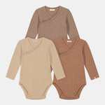 This bundle contains 3 long sleeve fold-over rompers in the colors Dunes, Terra and Woodland .
