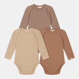 This bundle contains 3 long sleeve rompers in the colors Dunes , Terra , and Woodland .