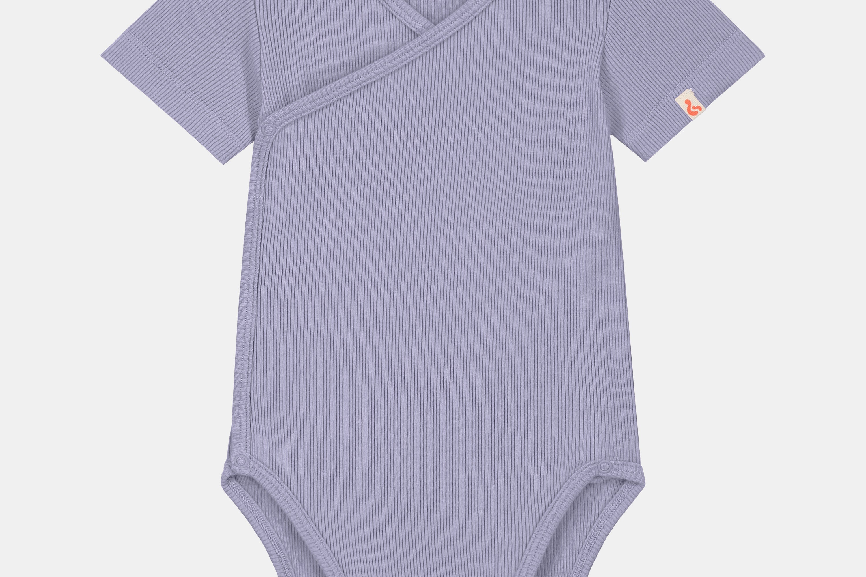 Short-sleeved fold-over romper. Fold-over romper in mystic lilac. Features grow-with-your-child buttons. Beautiful fit. Soft rib fabric made from 95% organic cotton and 5% elastane. Sustainably made in Portugal.